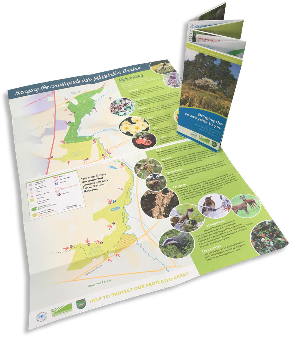 Second, Share-with care then helped to formulate a package of messages aimed at current residents and newcomers to ensure they better appreciate the value of Whitehill Town Council’s twin SANG asset. To that end a 24pp DL leaflet/poster was prepared for incorporation into the newcomers’ welcome pack. This material was confined to introducing the first SANG, Bordon Inclosure.