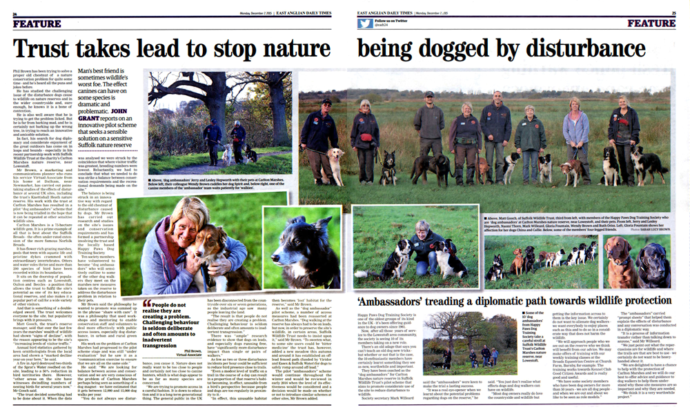 The scheme began in 2014 with the contacting of a local dog club (Lowestoft’s Happy Paws Dog Training Society) to enlist its members as dog ambassadors. Their role was to represent the reserve, assist Suffolk Wildlife Trust management in patrolling the site and help with resolving persistent dog owner/dog disturbance issues.